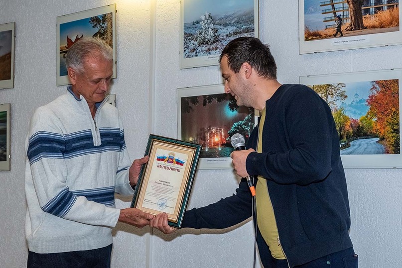 Руководитель фотоклуба и участники также поздравили Дмитрия Гаврилюка. После открытия автор провел экскурсию по выставке, рассказывая о съемках и вдохновении за каждым произведением.