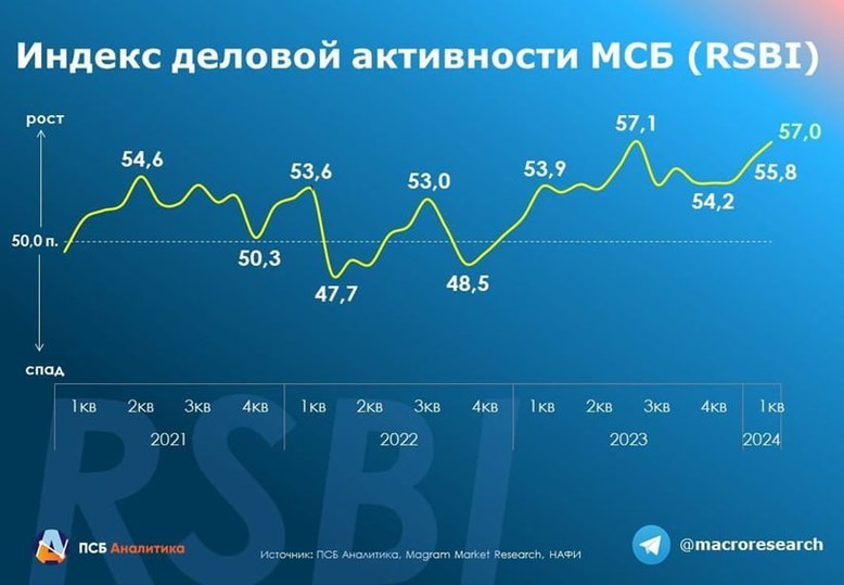 * Индекс RSBI (RussiaSmallBusinessIndex) рассчитывается по четырем компонентам: продажи, кадры, доступность финансирования и инвестиции. Его значение выше 50 пунктов говорит о росте деловой активности, ниже – о её снижении.Исследование проводится ежемесячно с 2020 года для оценки настроений малого и среднего бизнеса в России.