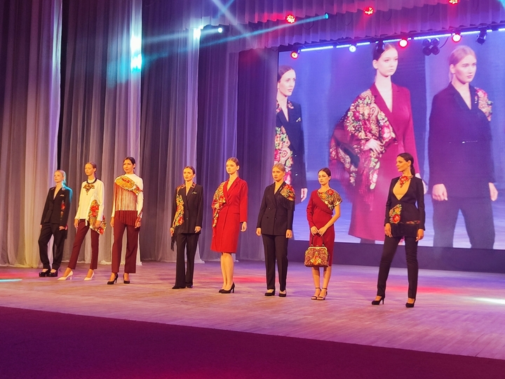 Гостей и жюри конкурса сразила коллекция «Русский платок» Елены Лесовец из Луганска. В центре внимания - традиционный аксессуар, который объединил официальный стиль с народным колоритом.