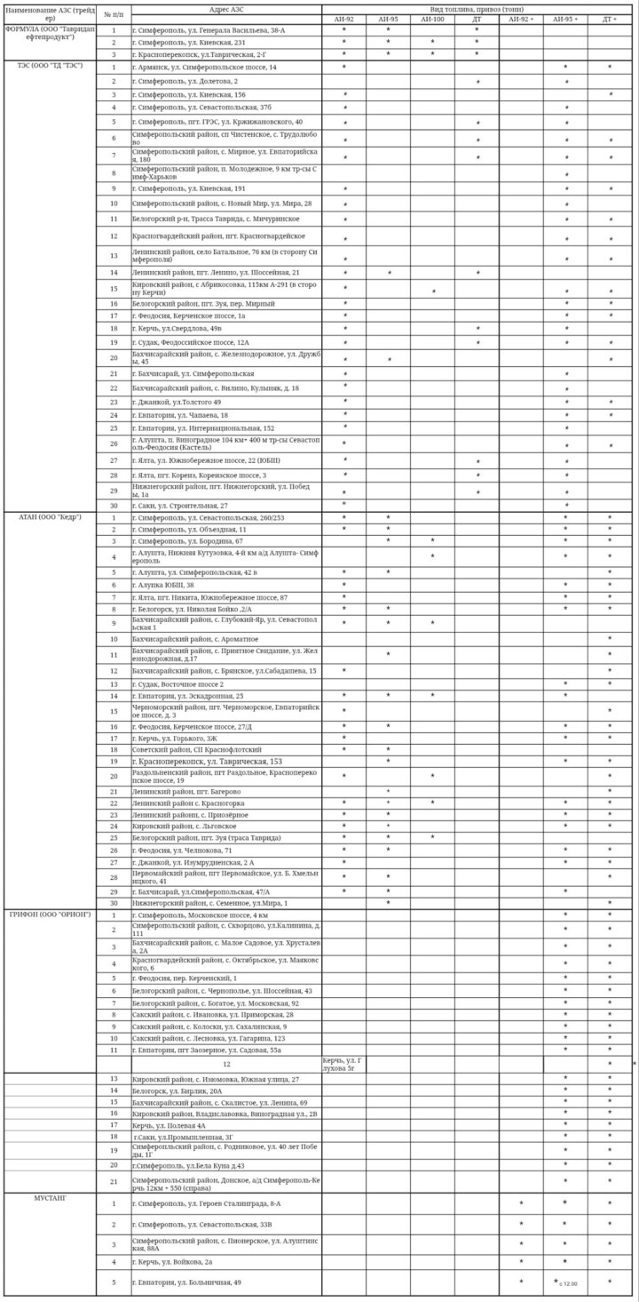 Председатель Совета министров Республики Крым Юрий Гоцанюк в своем Telegram-канале опубликовал список автозаправочных станций, где можно заправиться топливом.