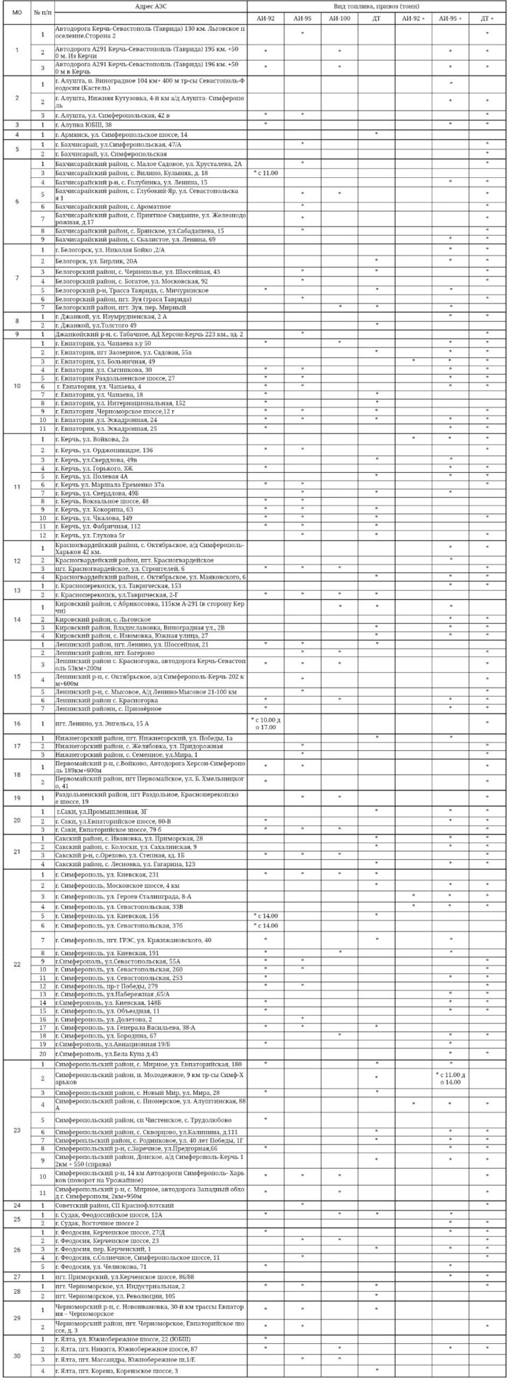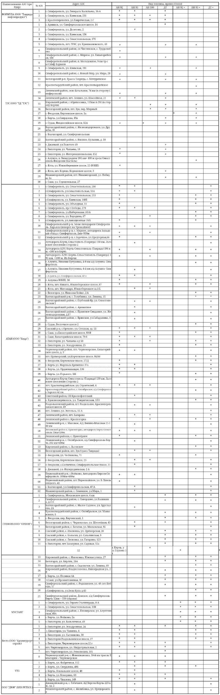 Председатель Совета министров Республики Крым Юрий Гоцанюк опубликовал список адресов с заправками, на которых осуществляется продажа бензина по состоянию на вторник, 21 октября.