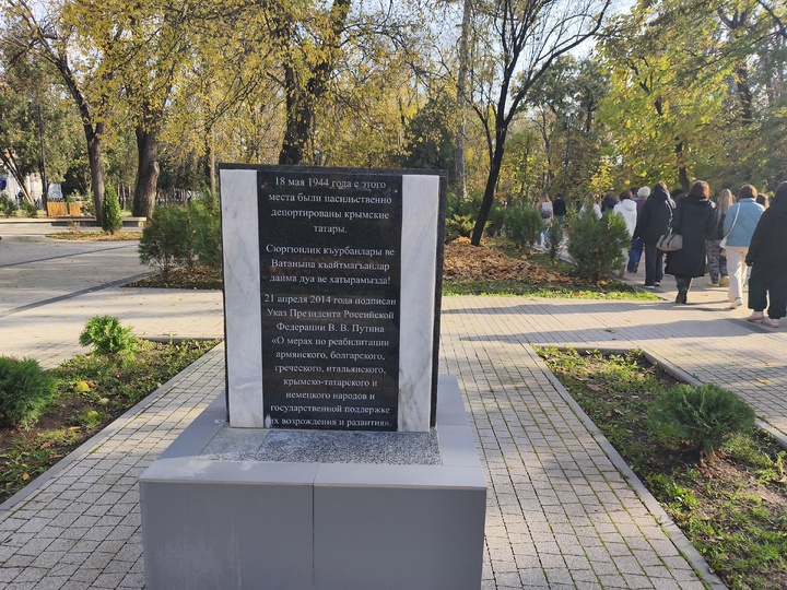 Посредине сквера стоит небольшой мемориал, посвященный памяти жертв депортации народов Крыма. Именно с этого места в 1941 году были депортированы русские немцы, которые жили здесь со времен Екатерины II. Через год депортировали итальянцев, в 1944-м - крымских татар, турок, цыган, армян, греков, болгар. Их вывозили в отдаленные республики Советского Союза, где они жили в спецпоселениях.