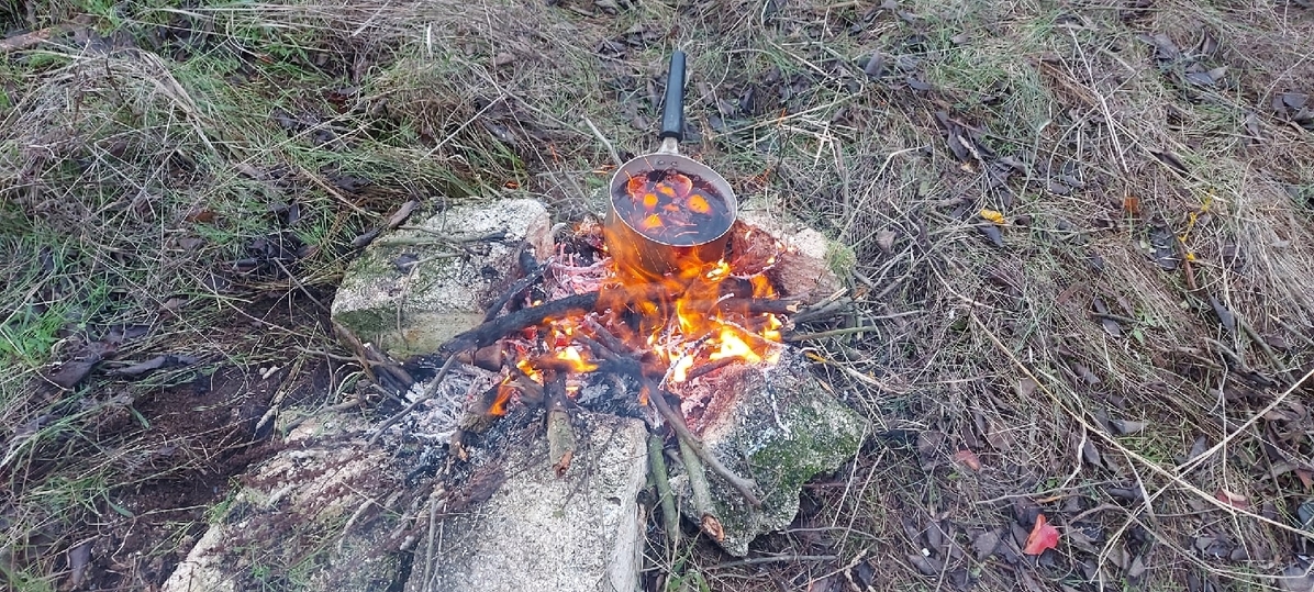 Вокруг царила полная тишина, только костер потрескивал под старым, закопченным котелком. Огонь удалось развести не с первого раза, почти все дрова были влажными. Однако все препятствия оказались преодолены, и колдовской глинтвейн с добавлением сорванного тут же шиповника загадочно побулькивал. Мы стали вокруг костра и начали читать стихи. Со стороны это явно выглядело будто магический ритуал по призыву духов стихий.
